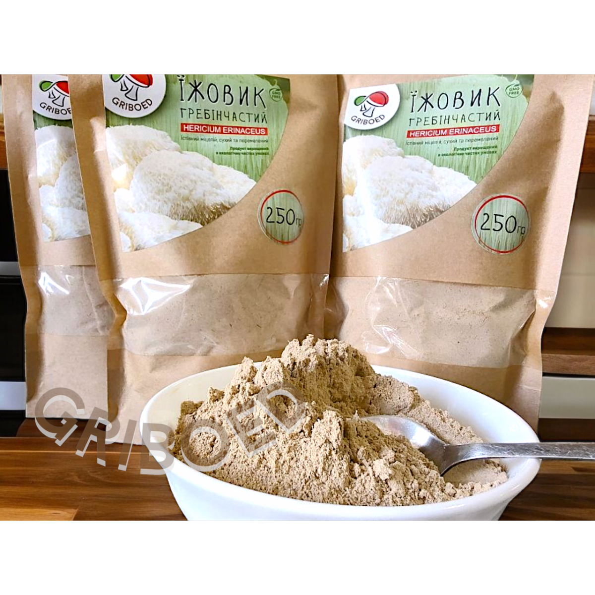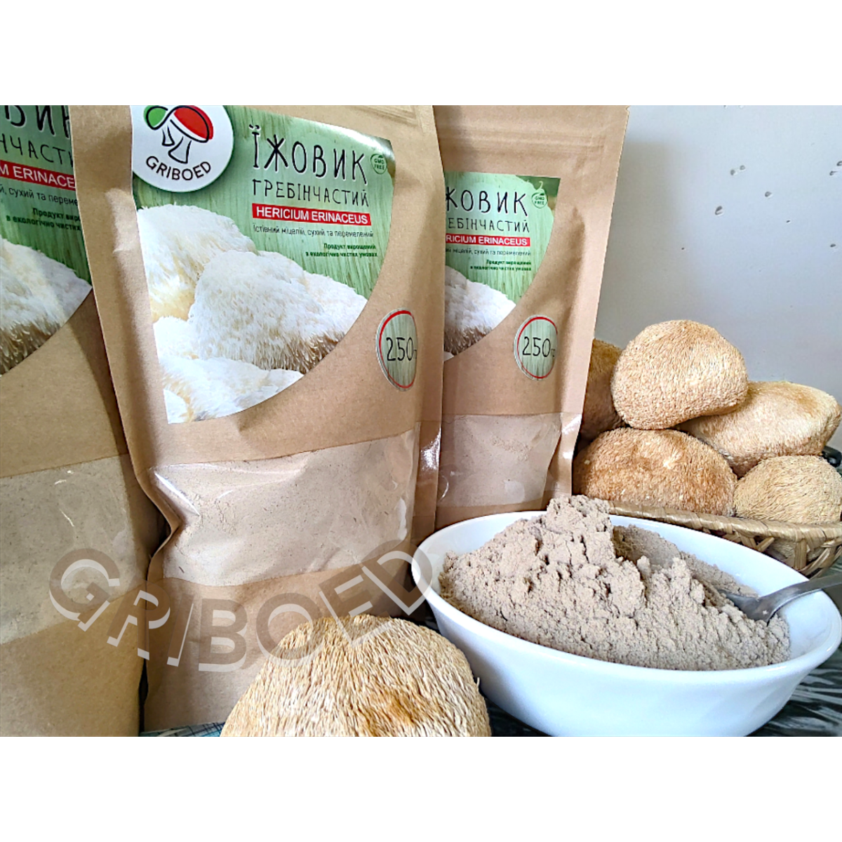 5) Їжовик гребінчастий сухий перемелений (70% міцелій + 30% плодові тіла), фасування: