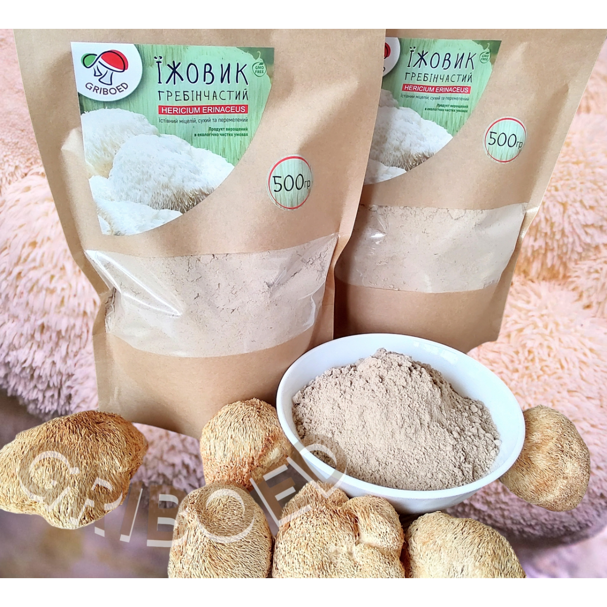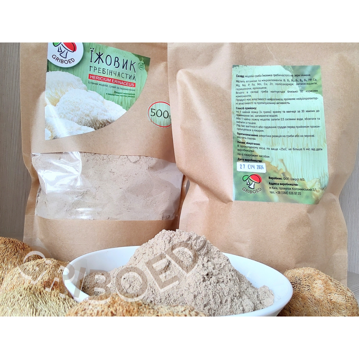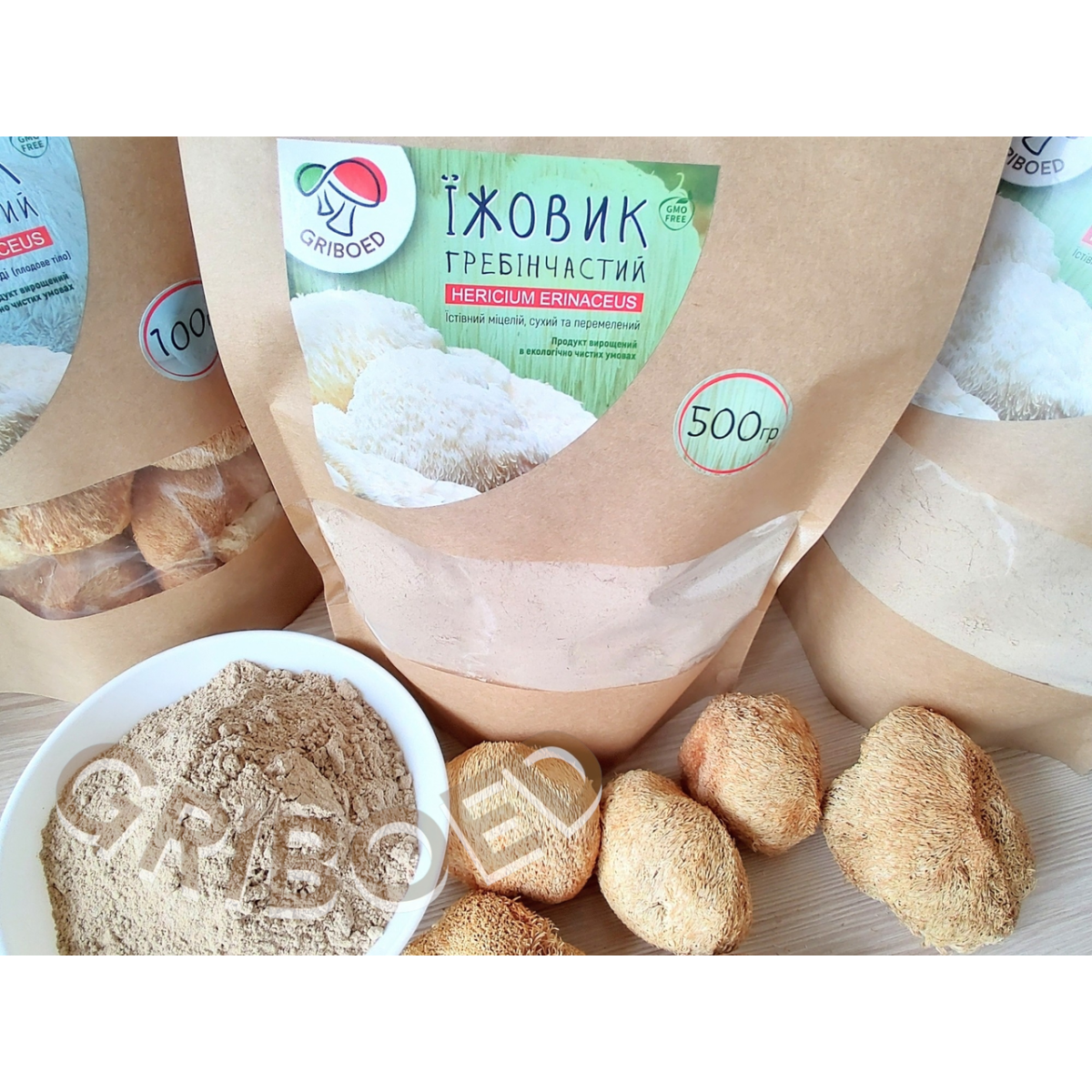 Тому пропонуємо міцелій Їжовика гребінчастого, вирощений на ячмені. Для зручності вживання наш міцельний висушений і перемелений на порошок.