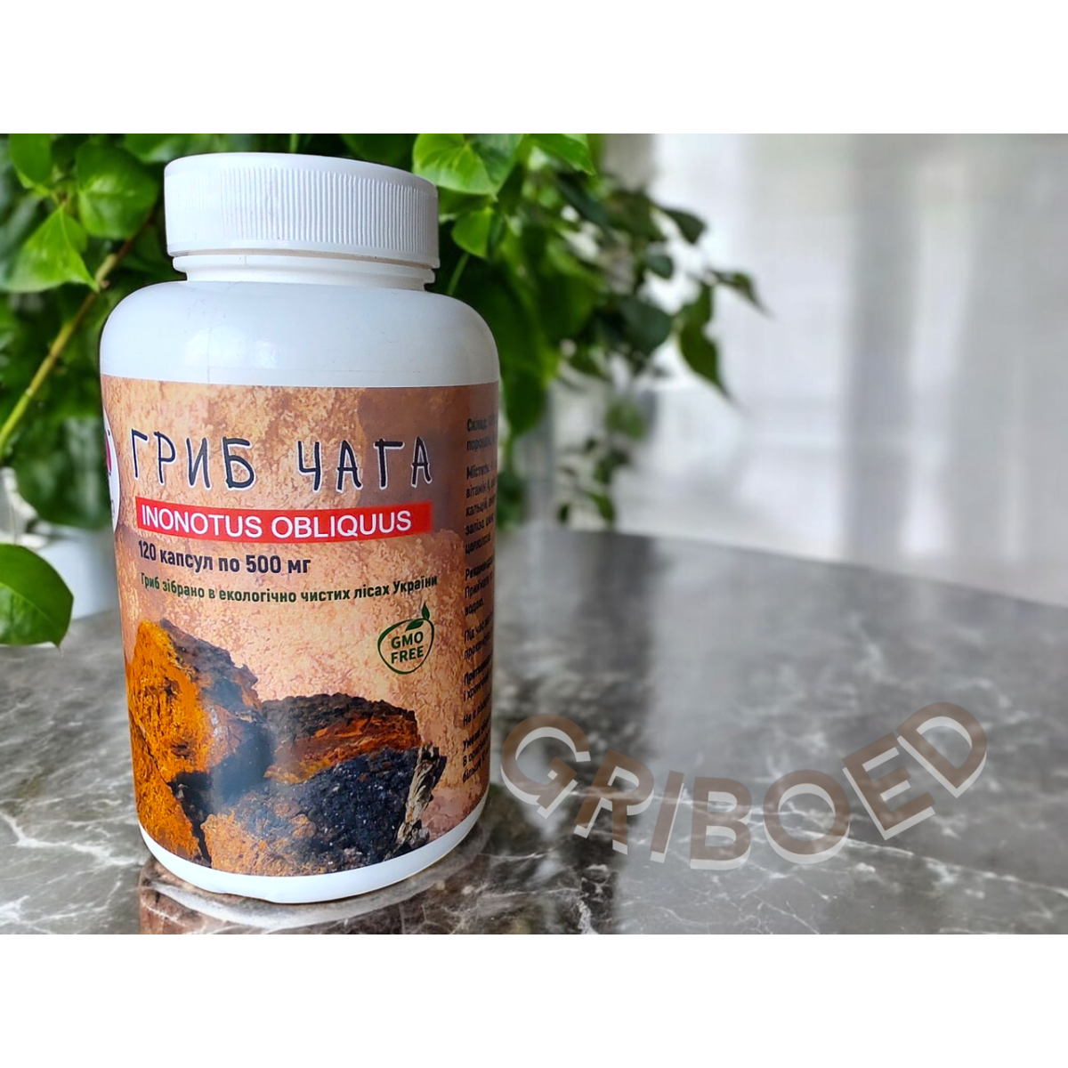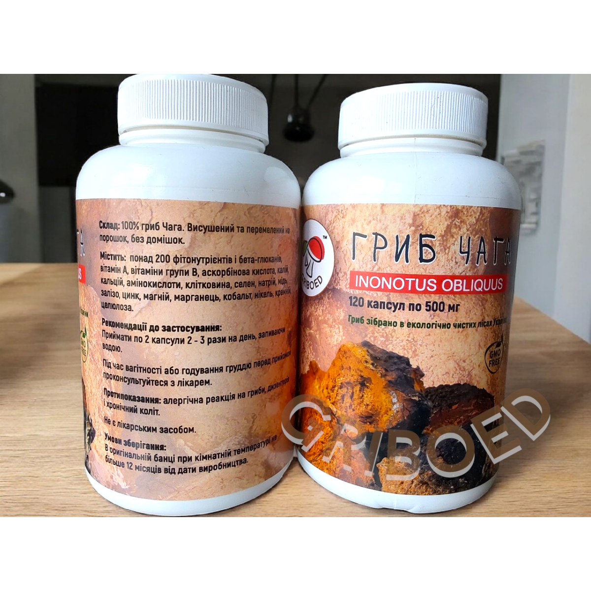 У нашій банці 120 капсул по 0,5 грам сухого перемеленого в порошок гриба Чаги в кожній капсулі.