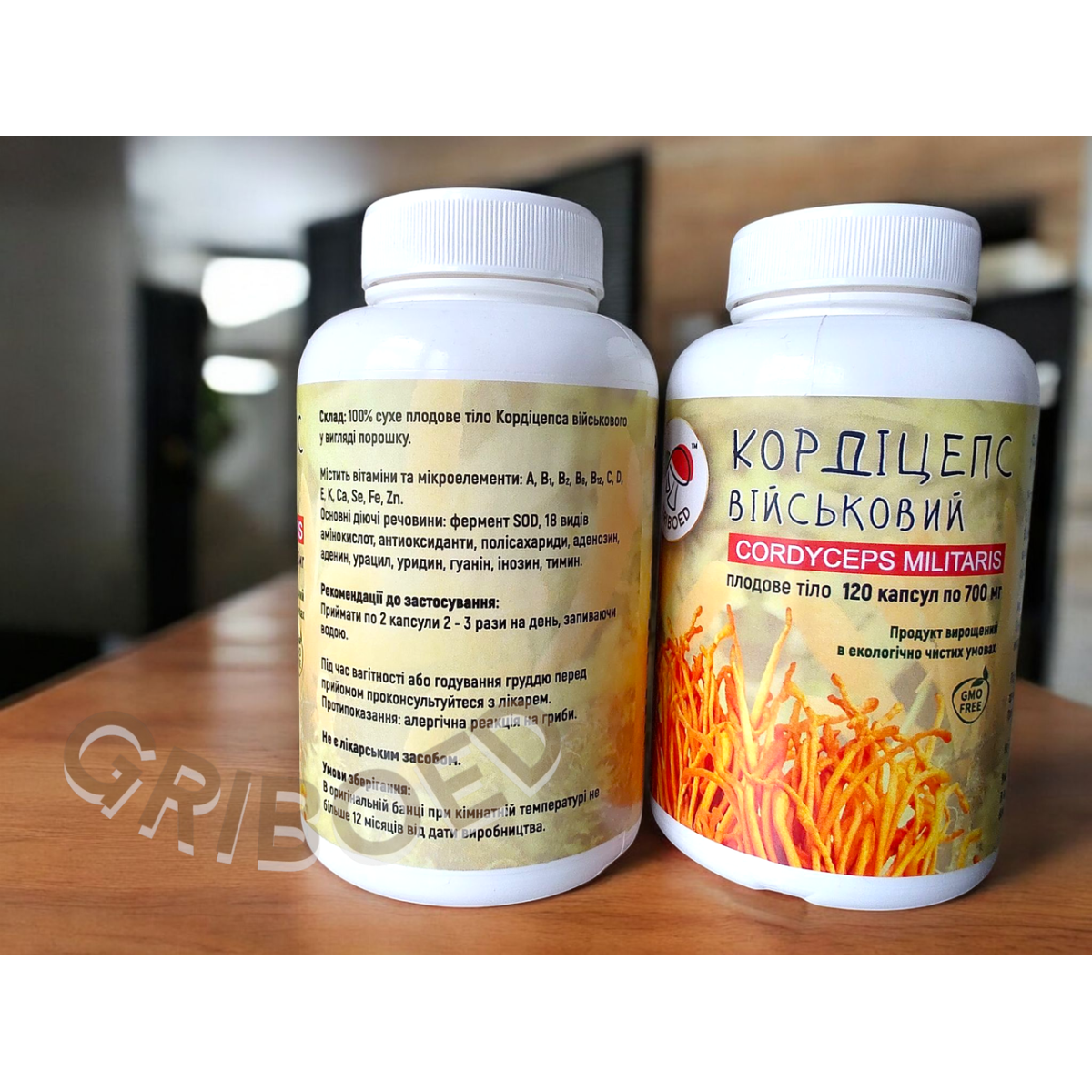 У банці 120 капсул по 0,7 грам сухого перемеленого в порошок Кордіцепсу (плодове тіло) в кожній капсулі.