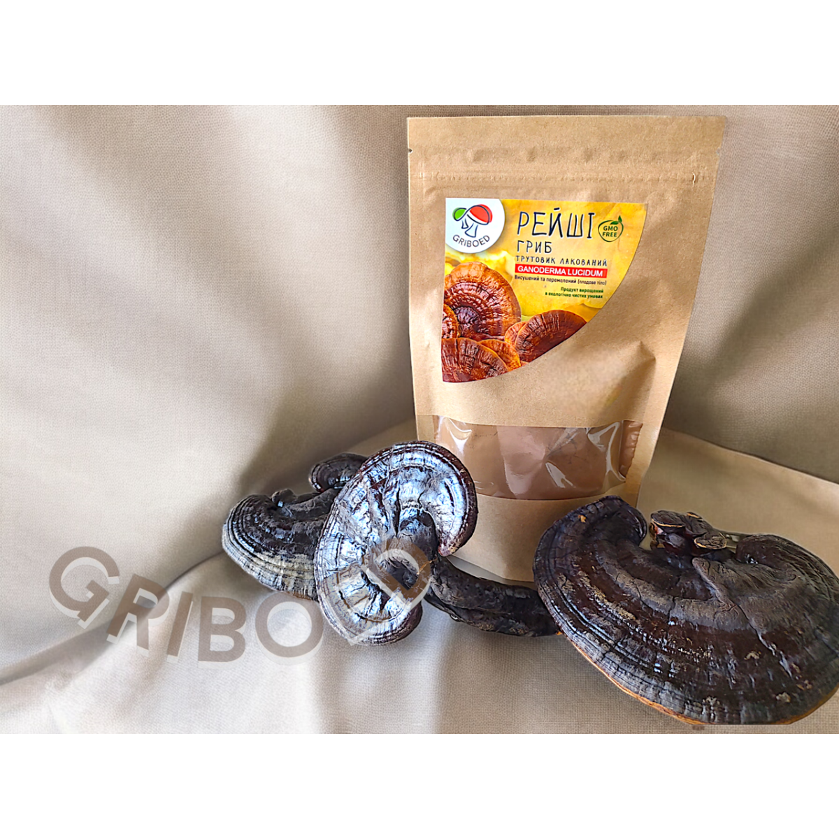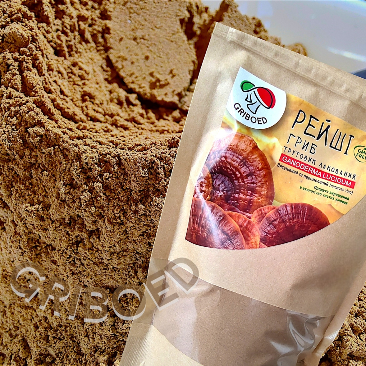 Цілий гриб Рейші (плодові тіла) для зручності вживання, висушений і перемелений на порошок.