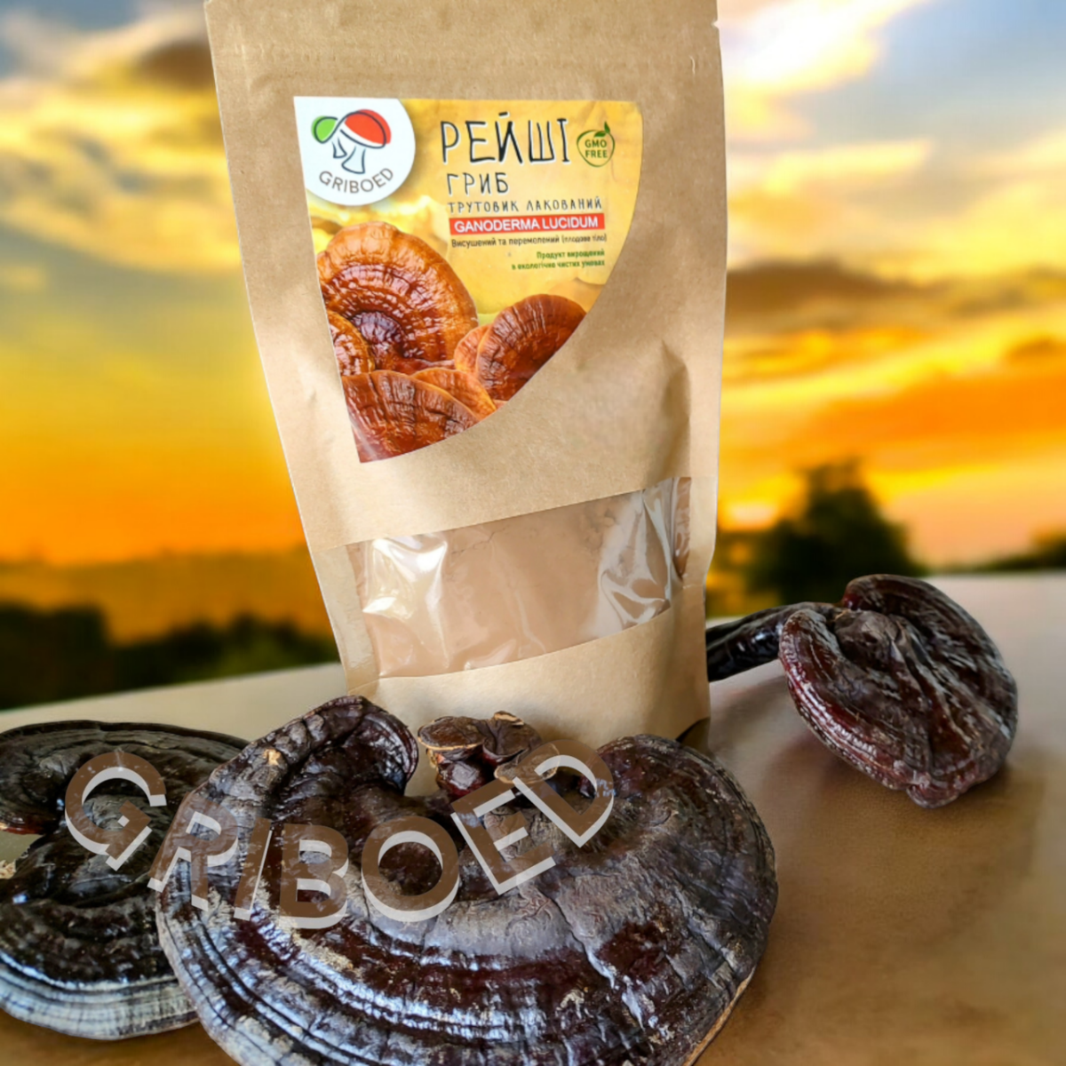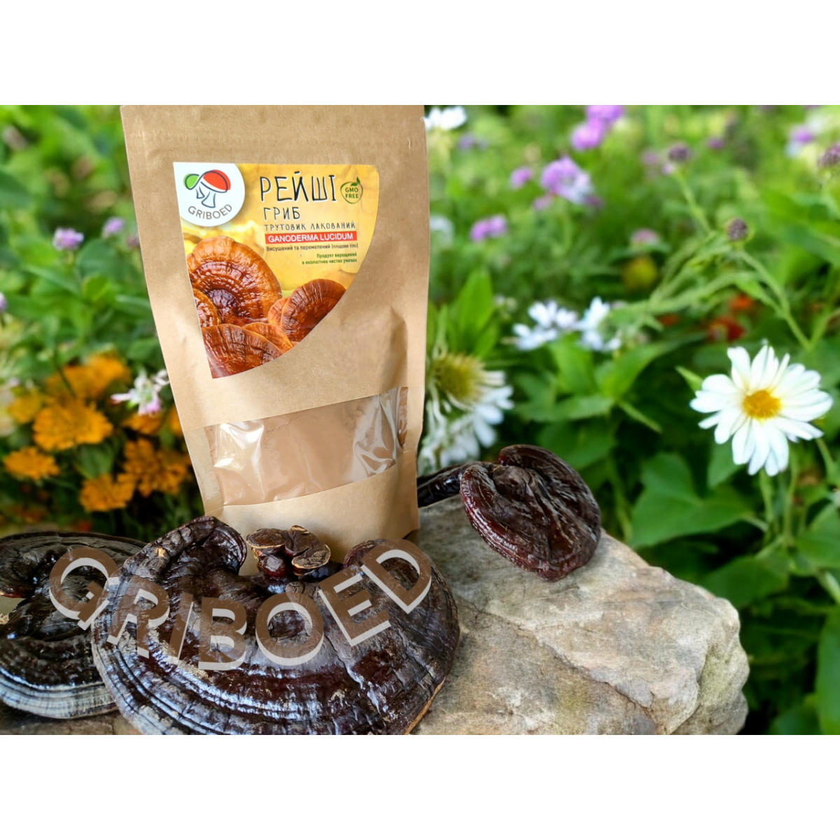 Гриб Рейші (плодові тіла) для зручності вживання, висушений та перемелений на порошок.