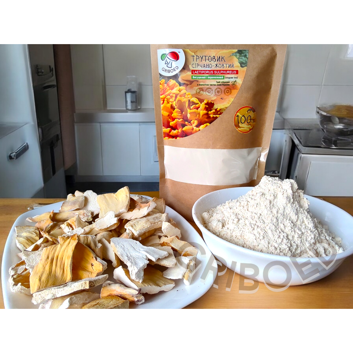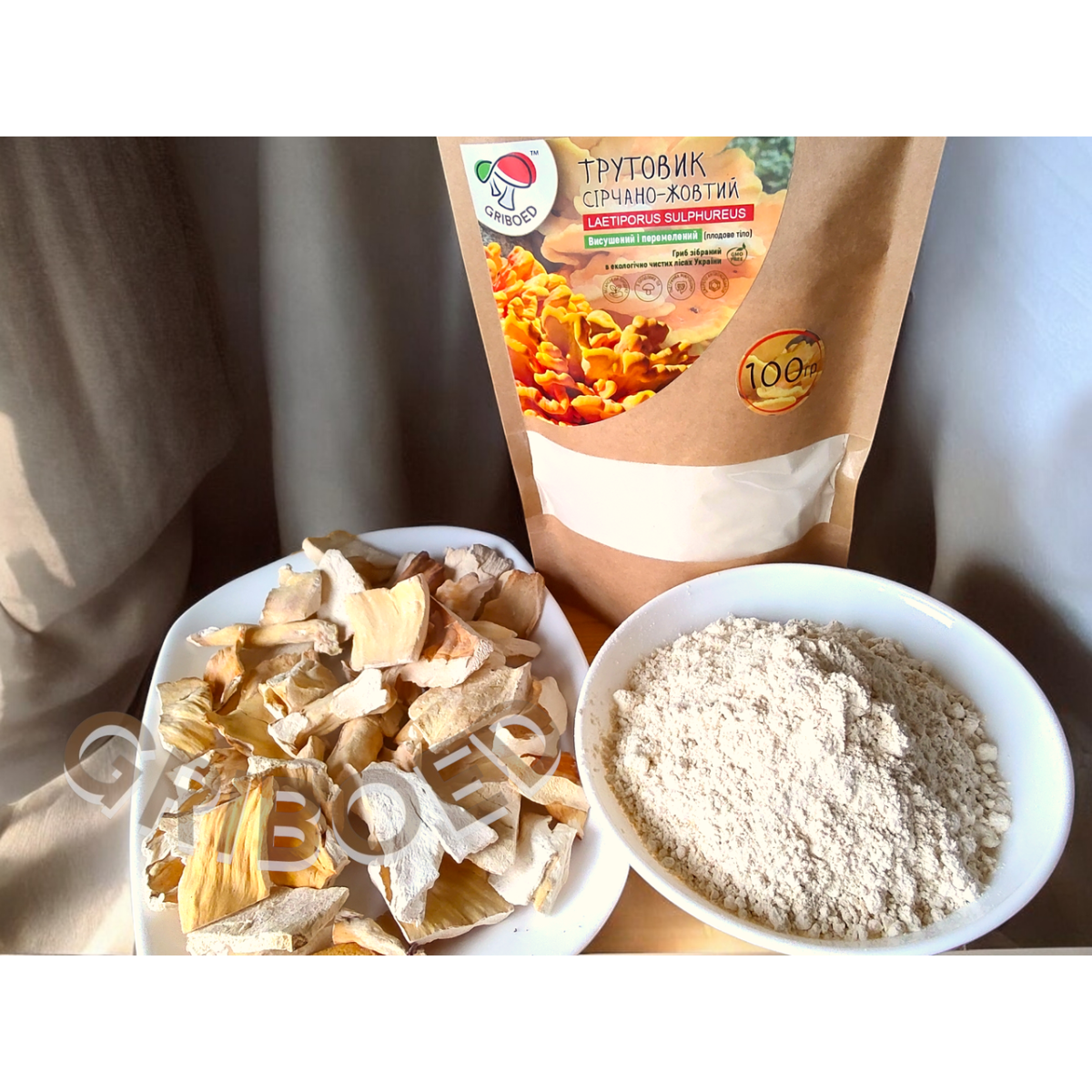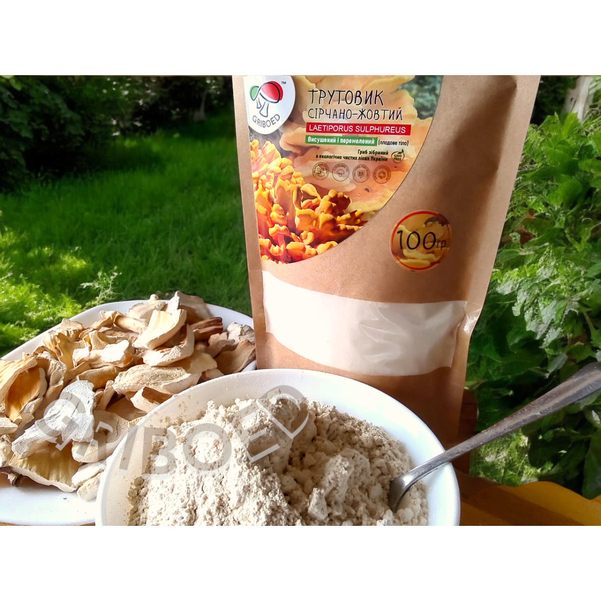 Трутовик Сірчано-жовтий, висушений і перемелений на порошок. Зібраний в екологічно чистих лісах України.