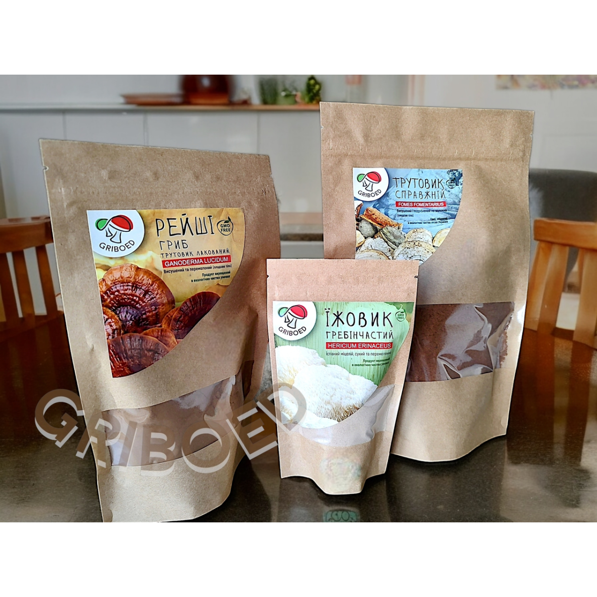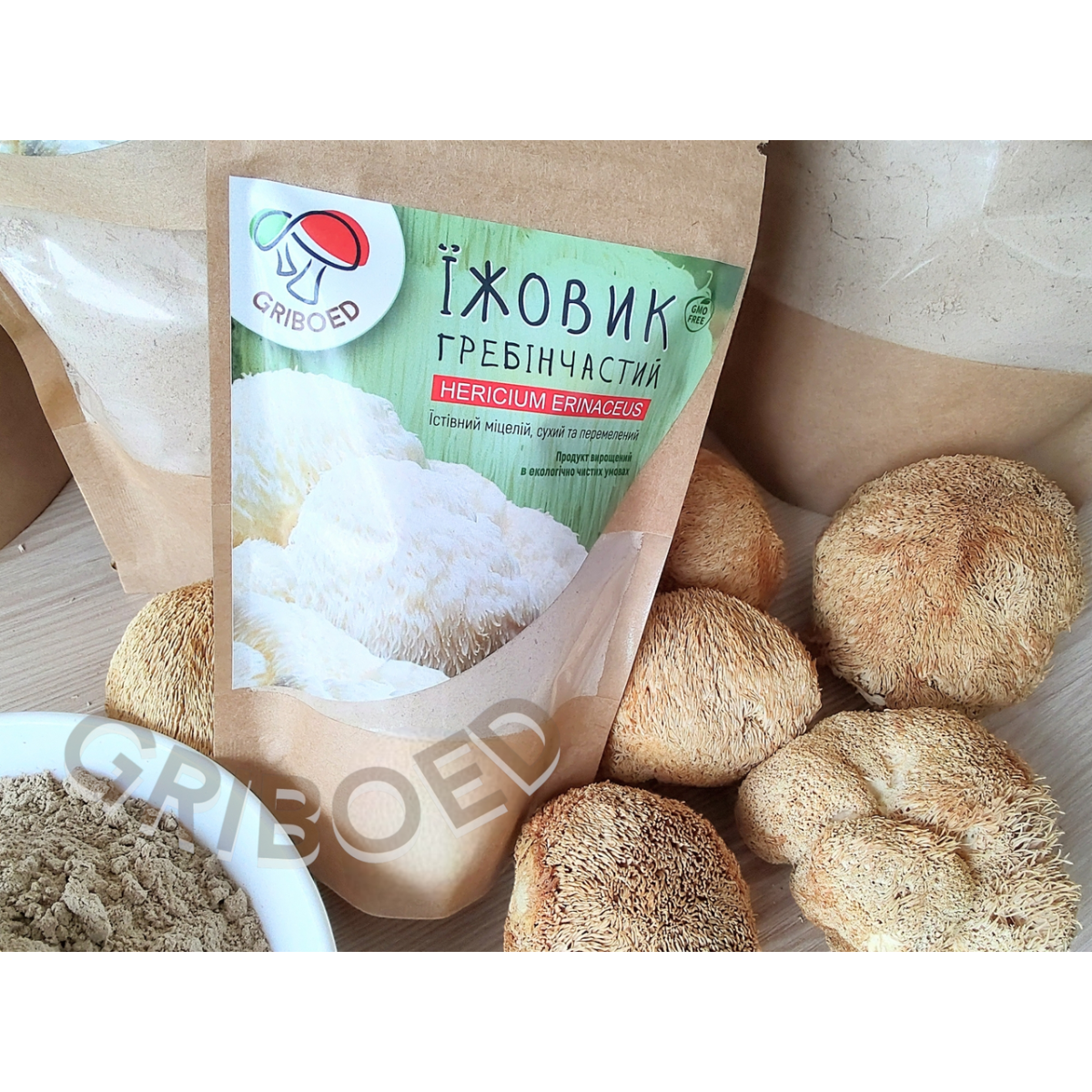 5) Їжовик гребінчастий сухий перемелений (70% міцелій + 30% плодові тіла), фасування: