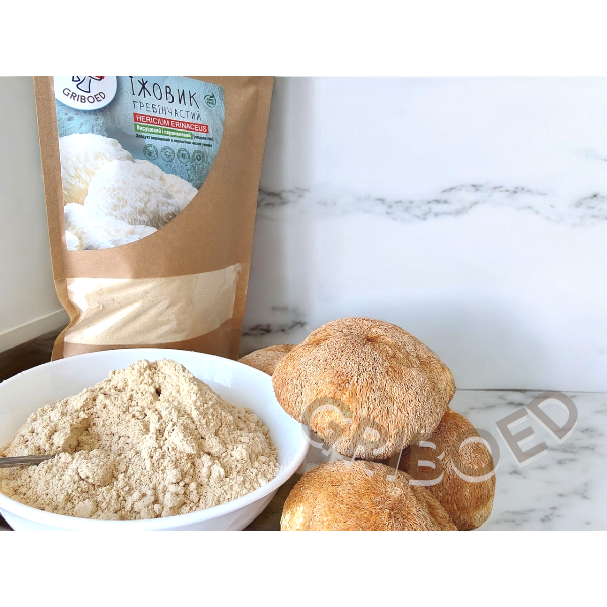 5) Їжовик гребінчастий сухий перемелений (70% міцелій + 30% плодові тіла), фасування: