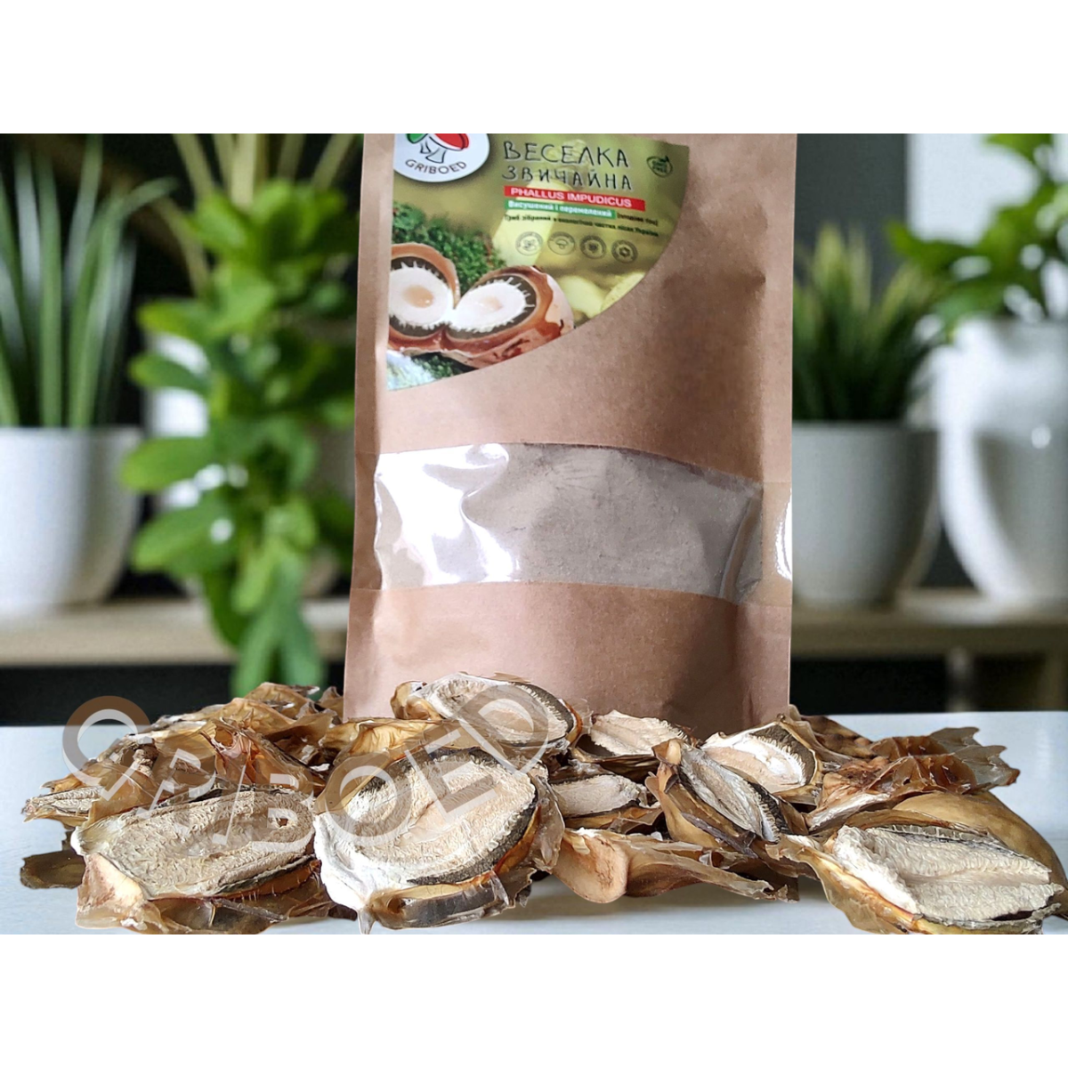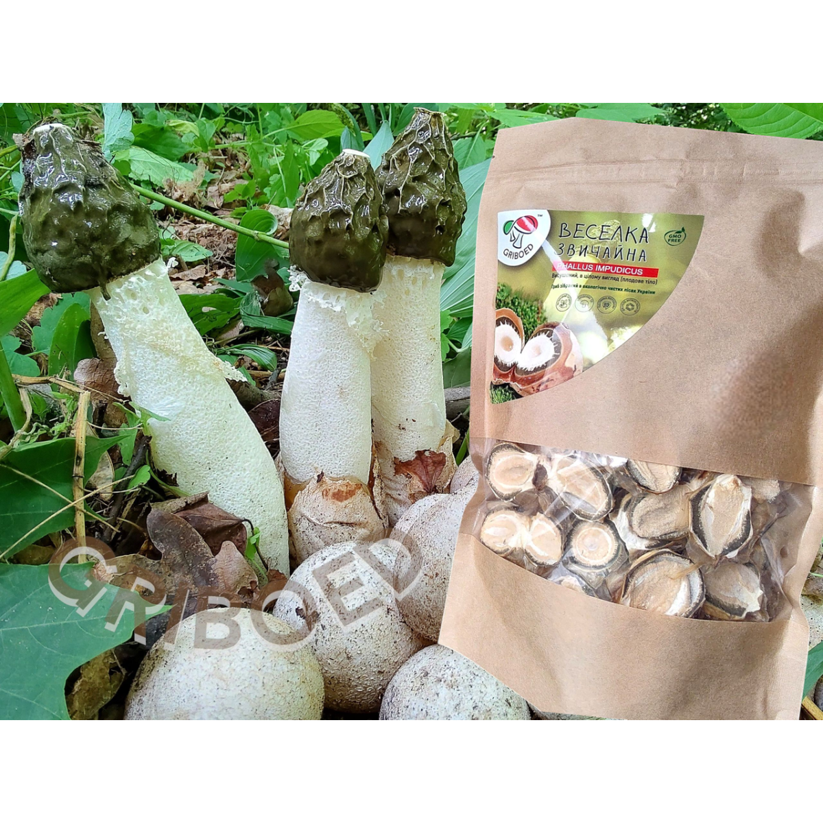 Це плодові тіла гриба, зібрані у стадії яйцеподібної форми, коли гриб акумулює у собі максимальну кількість цілющих речовин. Гриб висушений при температурі 38 - 40 °. Кожне яйце Веселки розрізане на кілька частин для якісного сушіння. В упаковці 150 г сухого цільного гриба.